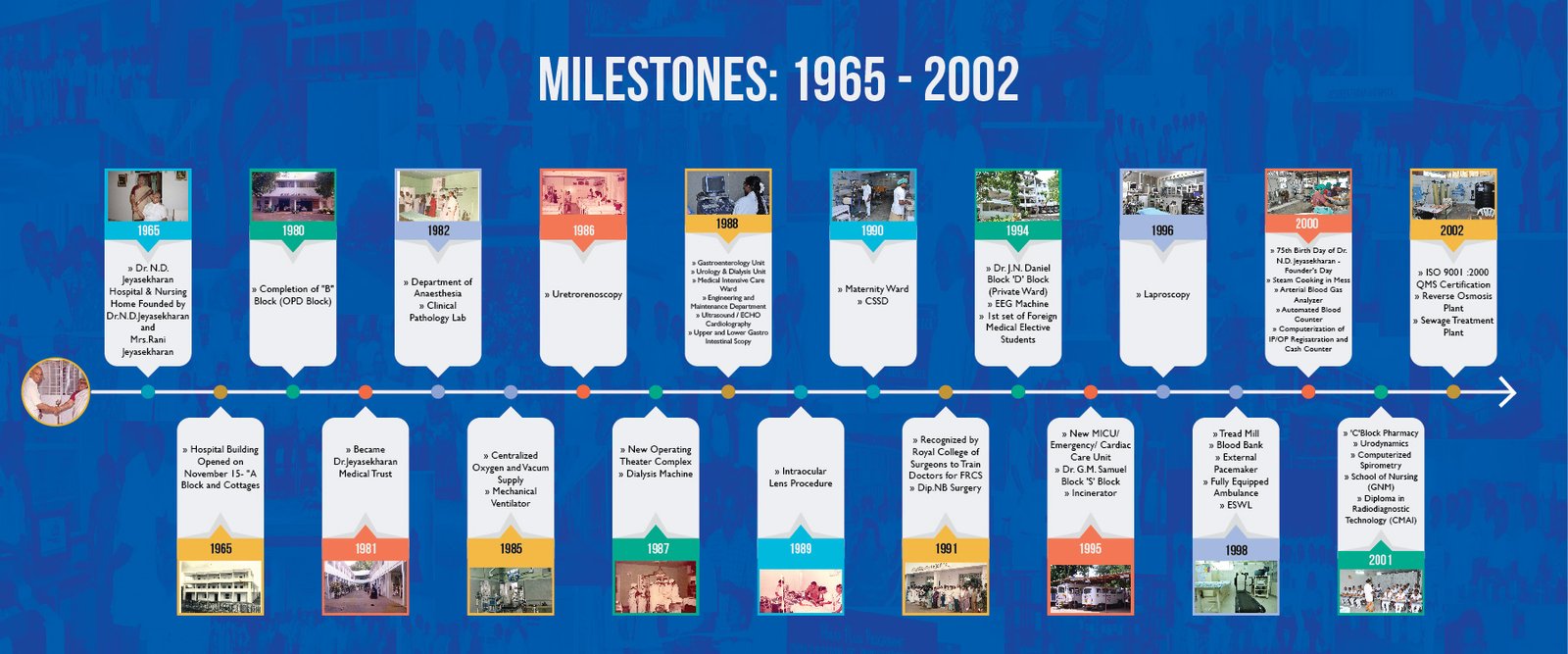| 2000 | • 75th Birthday of founder Dr. N.D. Jeyasekharan and Founder's Day function held on 15th March 2000 • Formal A & E services with a multidisciplinary trauma team (Orthopaedic/ Neurosurgical/ General Surgical/ Medical and Anaesthesiological components) • Arterial Blood Gas Analyser inaugurated on 25th November 2000* • Transvenous pacing for Emergency cardiac care • Duodenoscopy services started • Neurosurgical work commenced • Automated Complete Blood Counter* • Electronic Data Processing – OP and IP registration and cash counters went online (LAN) on 1stFebruary 2000* • Steam cooking in the hospital mess |