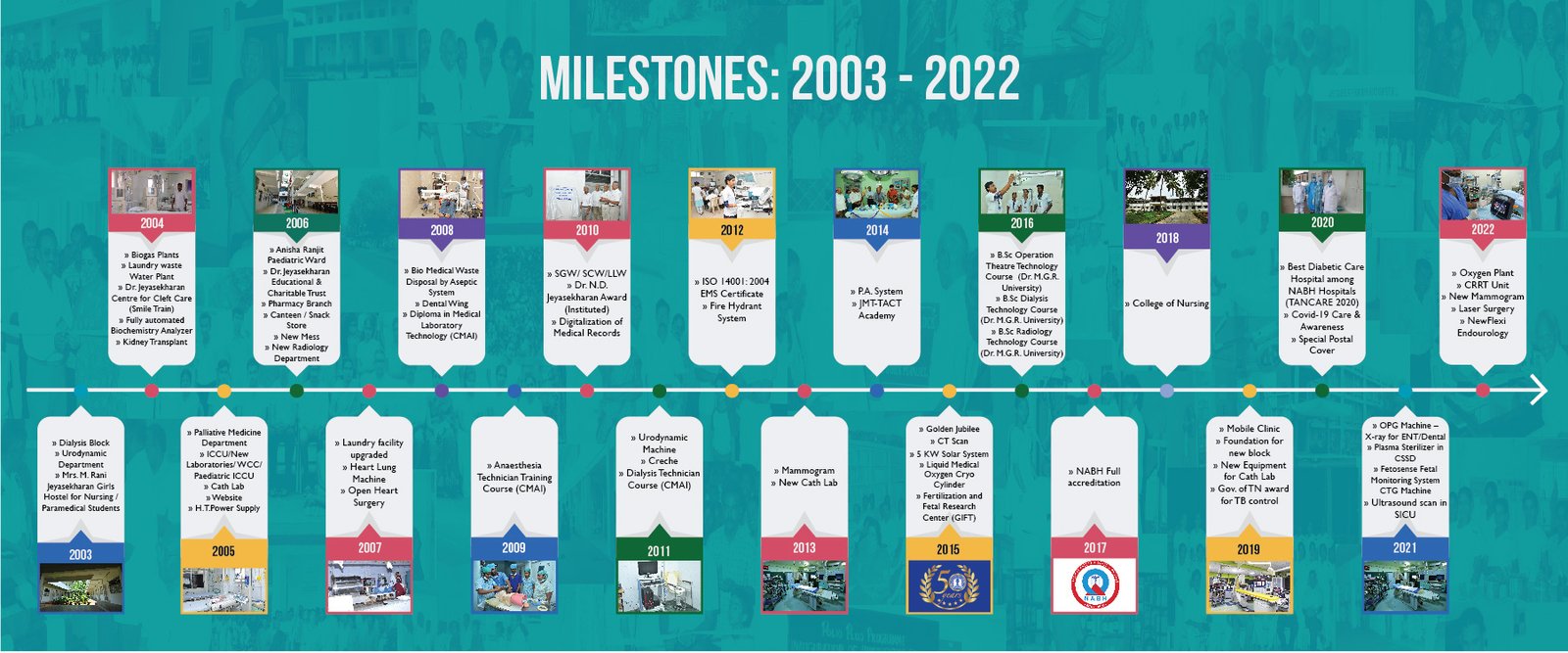 | 1996 | • Hospital selected by the Tamil Nadu Peoples Consumer Forum as the Hospital for ‘Best Nursing Care' in the District • Laparoscopic surgery started |