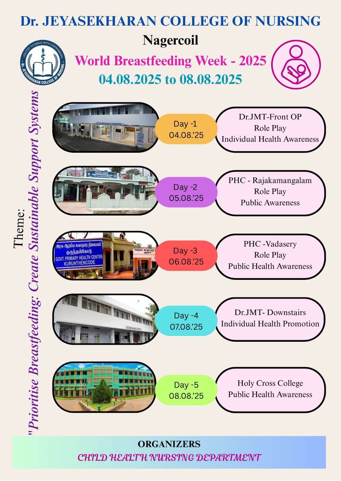 The first week of August (01.08.2025 – 07.08.2025), Dr. Jeyasekharan College of Nursing Celebrated World breastfeeding week with the theme “Prioritise Breastfeeding: Create Sustainable Support Systems” B.Sc Nursing VI semester students took part actively throughout the week in various activities.