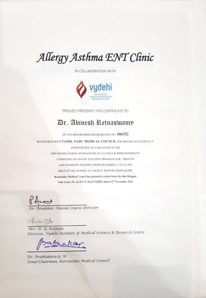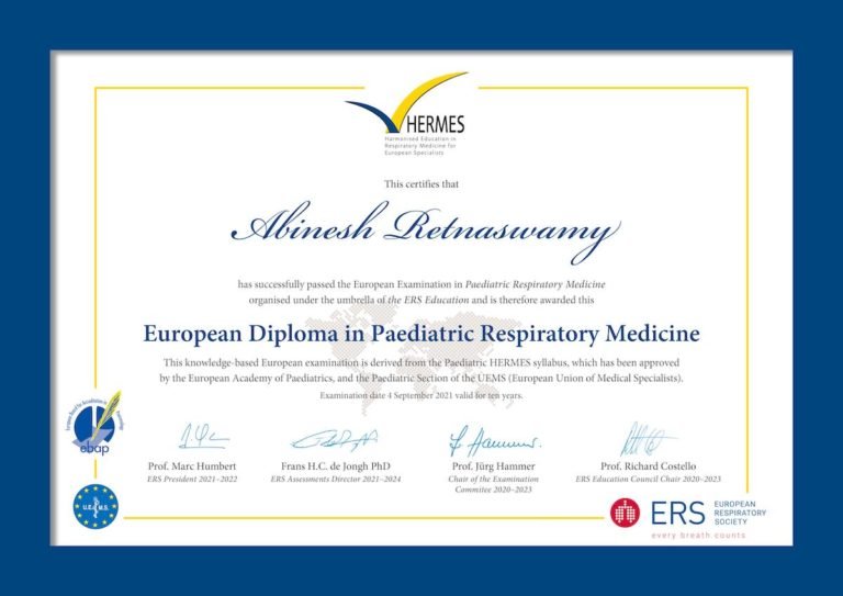 We congratulate Dr.Abinesh.R of our Paediatric Pulmonologist for his successful completion Paediatric Respiratory Medicine under the umbrella of the ERS (European Respiratory Society) Education. He also finished his advanced course on Diagnosis of Allergy & Immunotherapy at Allergy Asthma ENT Clinic in collaboration with Vydehi Institute of Medical Sciences & Research Centre. Our Hospital is very happy and grateful for your skill and service and wish that the speciality grows in this Institution.