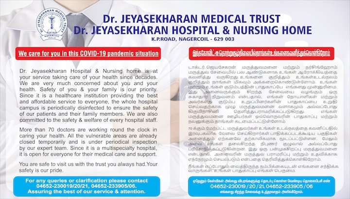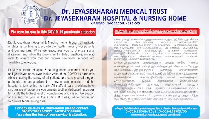 Dr. Jeyasekharan Hospital & Nursing home is committed to you and your loved ones, even in this wake of the COVID-19 pandemic while ensuring the safety of all patients and care givers. Stringent protocols are being followed to prevent contamination and the hospital is functioning normally. All staffs & care providers have strict usage of protective equipment’s & other dedicated resources to handle the highest level of complexities and cases. We support and stand by you in these difficult times, while continuing to provide tender loving care. For any queries or clarification please contact 04652-230019/20/21, 04652-233905/06. Assuring the best of our service & attention.