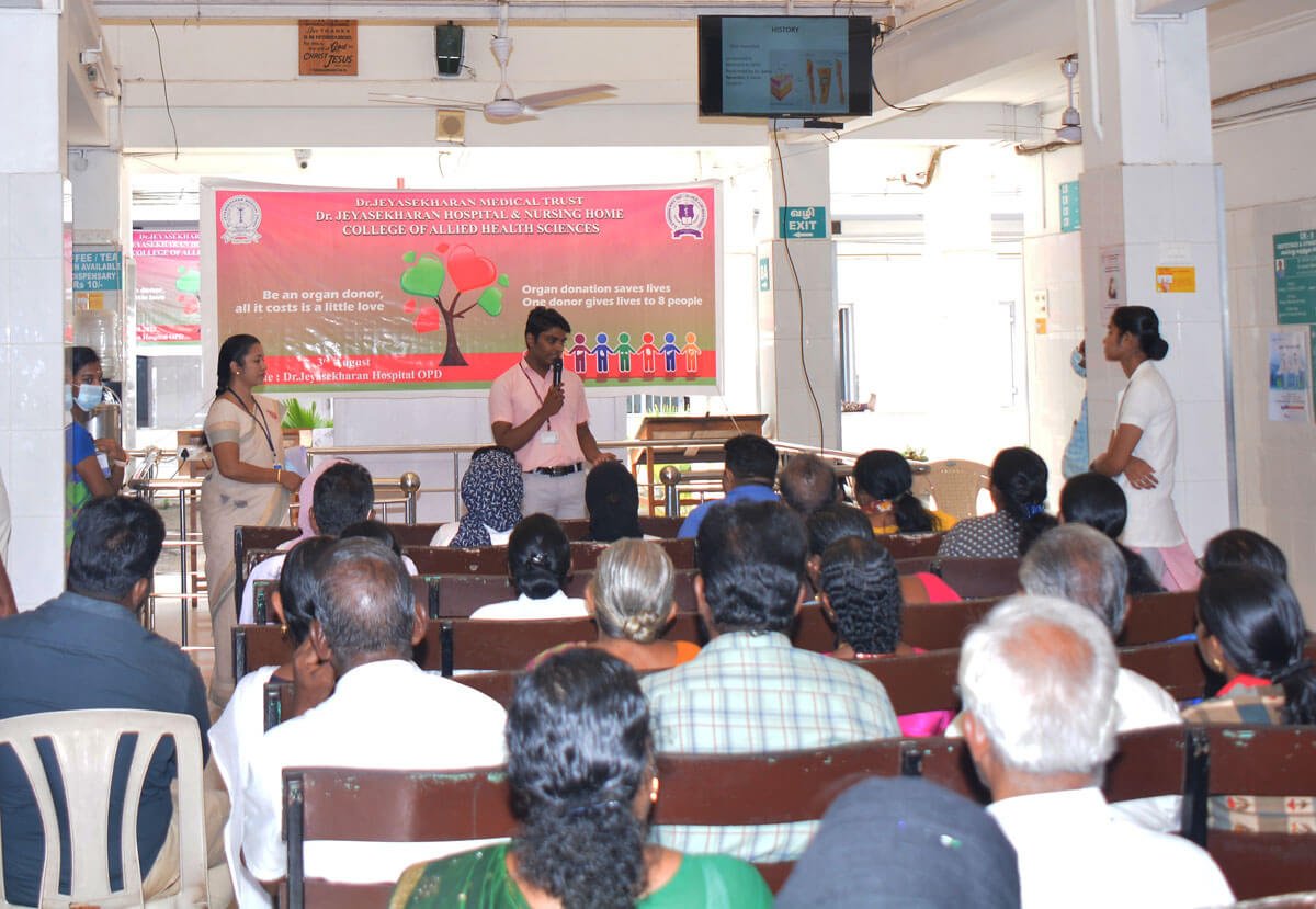 “Indian Organ Donation Day” was celebrated at Dr.Jeyasekharan Hospital & Nursing Home, OPD section on 03.08.2023 to create awareness about Organ donation. The Program organized by Dr.Jeyasekharan Hospital and Nursing Home in collaboration with the College of Allied Health Sciences.