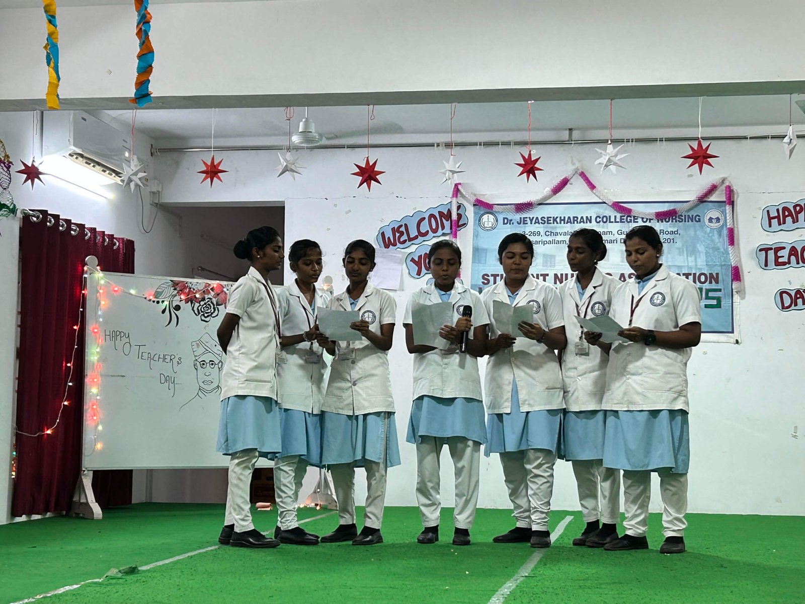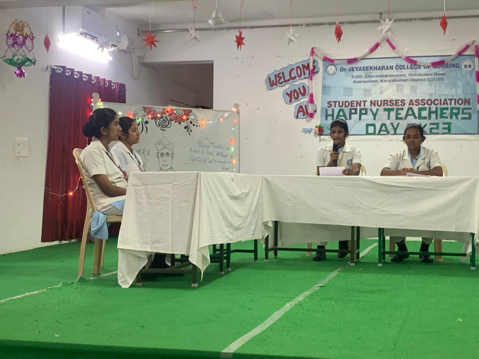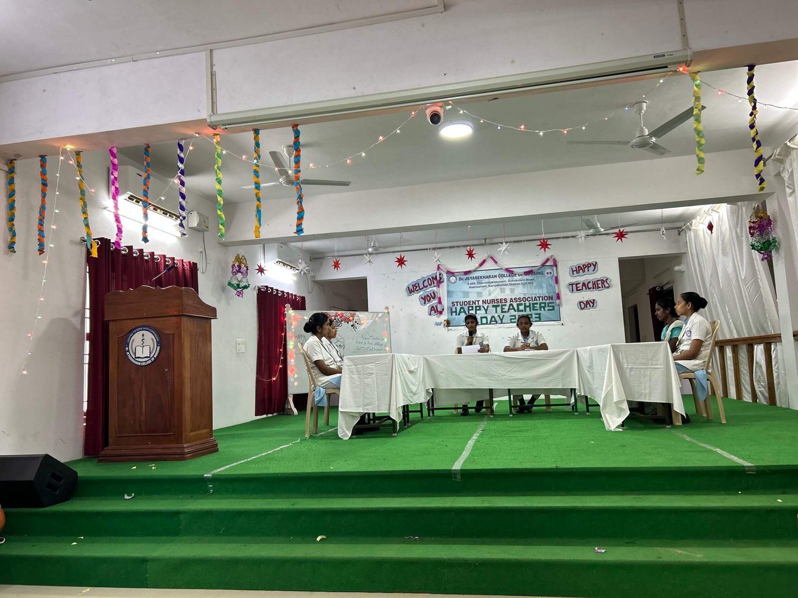 Teacher’s day program was organized and conducted by Student Nurses Association on 5th September 2023. The event started at around 3pm in the auditorium. B.Sc. Nursing, DGNM students and Teachers of Dr. Jeyasekharan College of Nursing participated in the event.