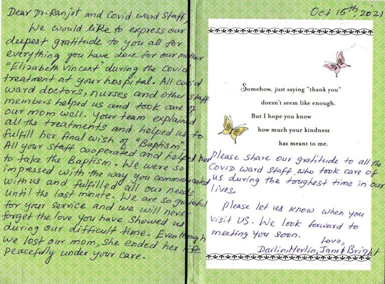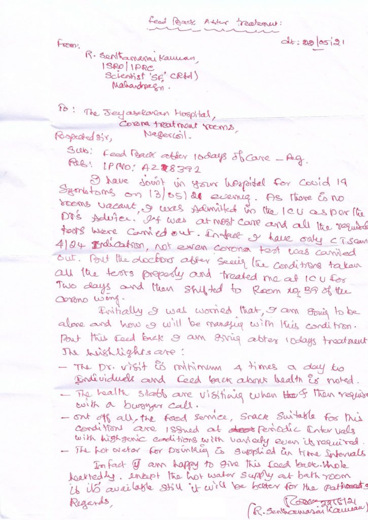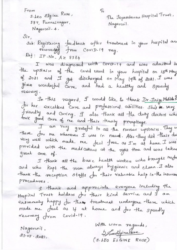 “My husband Mr.E.Vijay Jacobs was admitted in your hospital on January 8th, 2020 for removal of a kidney. During our stay in your hospital, we experienced the following:
